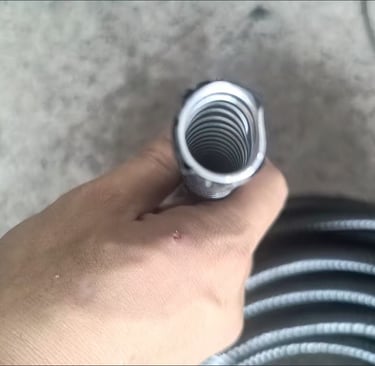 Flexible metal hose with plastic coating guards cables from moisture and impact.